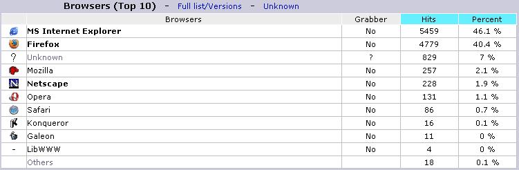 En esta pagina, despues de varios llamados de atencion a los usuarios que me leen, la cifra ha estado disminuyendo, Firefox ha obtenido terreno en cuanto a los exploradores que visitan esta pagina. El IE ya queda en segundo termino si juntamos Firefox, Mozilla, Netscape, Galeon y Konqueror. 😀